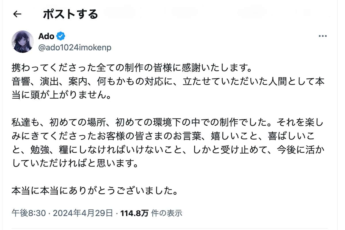 最後に登場したのはAdo。ライブではおなじみとなった巨大なボックスの中にシルエットが映し出され、アニメーションを背景に「唱」「新時代」「うっせぇわ」など10曲にわたって力強い歌声を響かせた。ステージ終盤に「新しい学校のリーダーズ、YOASOBIとステージをシェアしているのは夢のよう。日本の音楽と文化を体験してくれてうれしい。最高の夜だった」と日本語と英語で感謝を述べた。
